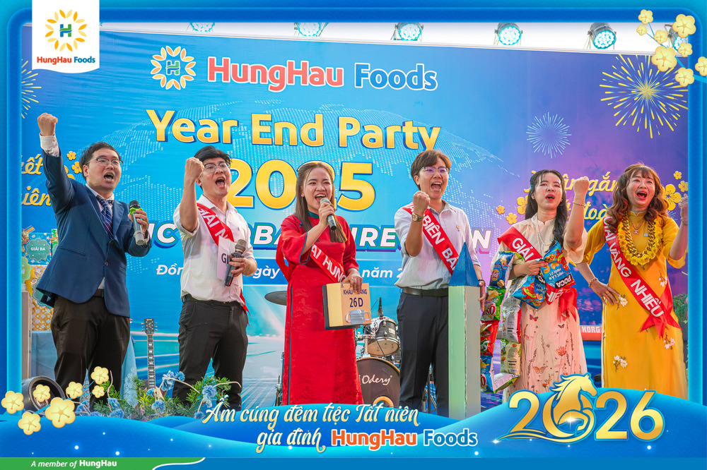 Tiệc Tất niên 2025 không chỉ là dịp nhìn lại chặng đường đã qua, mà còn là khoảnh khắc tri ân những người lao động thầm lặng phía sau mỗi sản phẩm đạt chuẩn, mỗi đơn hàng xuất khẩu đúng tiến độ. Dịp này, HungHau Foods đã vinh danh 24 công nhân sản xuất xuất sắc và 28 công nhân viên có thâm niên từ 10 năm trở lên. BTC cũng đồng thời trao các giải thưởng bốc thăm hấp dẫn, bao gồm: 03 giải Công đoàn, 10 giải Khuyến khích, 03 giải Ba, 01 giải Nhì, 01 giải Nhất và 03 giải Đặc biệt. Trong đó, có 02 giải Đặc biệt do Chủ tịch Hội Đồng Cộng Sự Ngôi nhà Hùng Hậu gửi tặng.