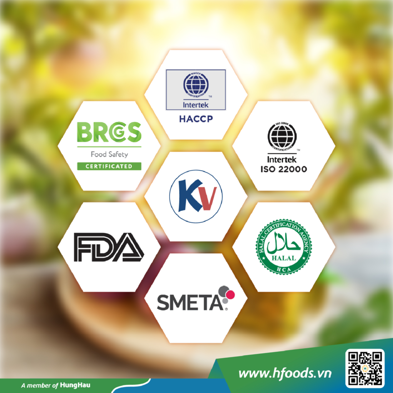 HungHau Foods đã đạt được các chứng nhận quốc tế uy tín, khẳng định dòng sản phẩm của HungHau Food đáp ứng được  yêu cầu khắt khe của thị trường